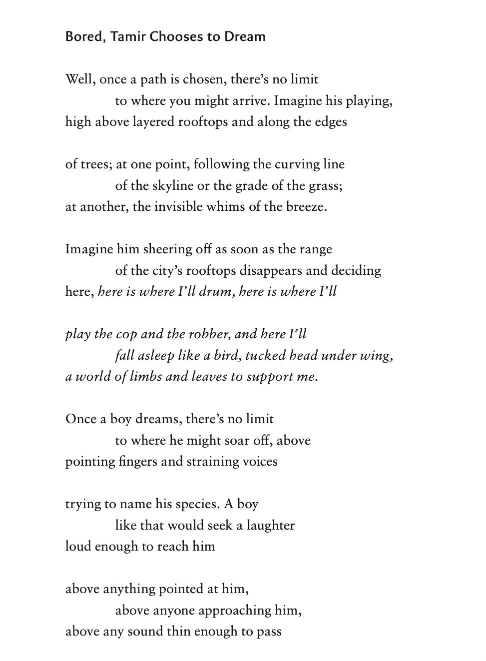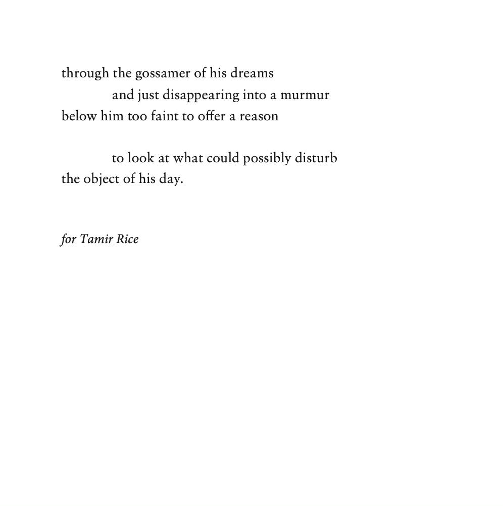 The poem begins nearly in mid-conversation (“Well…”) and shows Rice playing and daydreaming as children do. The poem imagines Rice as a bird or some kind of creature unidentifiable to onlookers. The poem is an elegy as well as a sober commentary on the tragedy, and its broader implications.